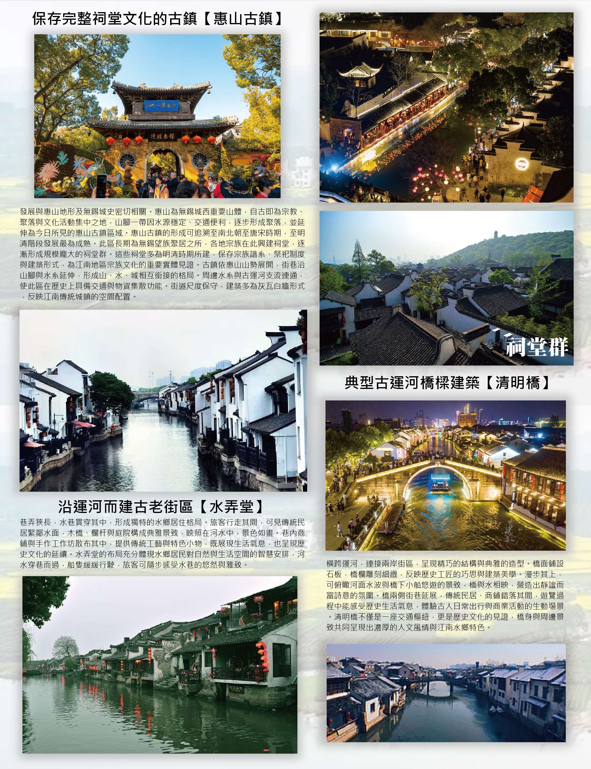橋影映水,古運河旁的水巷街區【清明橋.水弄堂】無錫古運河沿線保存完整的歷史街區之一,其發展與京杭大運河密切相關。清明橋本身為橫跨古運河的重要橋樑,歷史可追溯至宋代,歷經多次修建,成為無錫城內具代表性的運河橋梁。清明橋一帶自宋元以來即為無錫重要的水運與商業節點,運河貫穿城區,使此區逐漸形成依水而生的街市空間。明清時期,隨著運河航運興盛,沿岸聚集大量商鋪、作坊與民居,構成今日所見的運河街區格局。「水弄堂」指的是緊貼河道發展的狹窄巷弄,為江南水鄉典型街巷形式之一。巷道一側臨水,一側為民居或商鋪,居民日常生活與水道緊密相連,反映江南地區以水為核心的生活型態與城市結構。清明橋水弄堂沿古運河兩岸展開,橋、河、街、巷交織成連續空間。街區內保留石板路、臨水建築與傳統街屋立面,水道尺度狹長,形成視覺集中且延伸感強烈的運河景觀,為無錫城內少數仍維持原有運河街巷樣貌的區段。