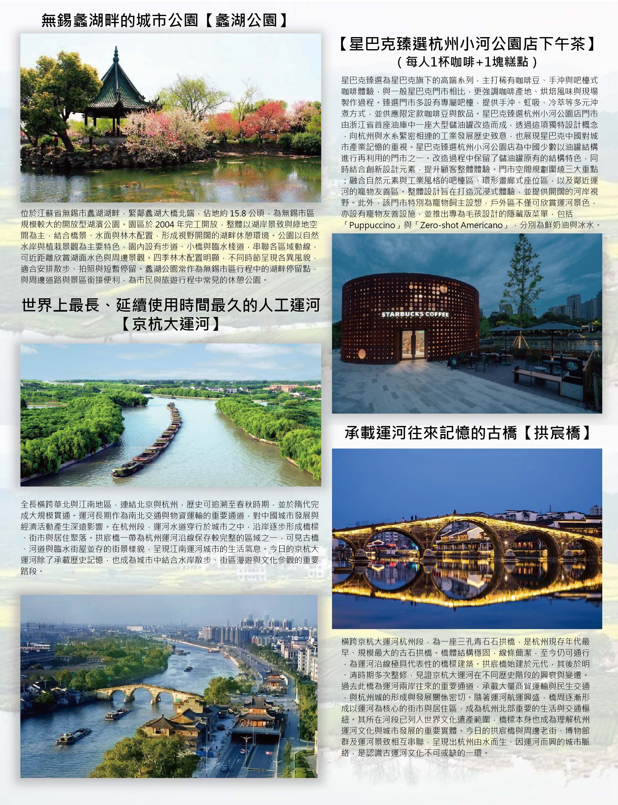 第七天【無錫-杭州】無錫太湖珍珠藝術館,開蚌取珠體驗開盲盒的樂趣→無錫蠡湖畔的 城市公園【蠡湖公園】→【星巴克臻選杭州小河公園店下午茶(每人1杯咖啡+1塊糕點)】 →世界上最長、延續使用時間最久的人工運河【京杭大運河】→承載運河往來記憶的古橋 【拱宸橋】→自由活動,漫步運河周邊【小河直街】