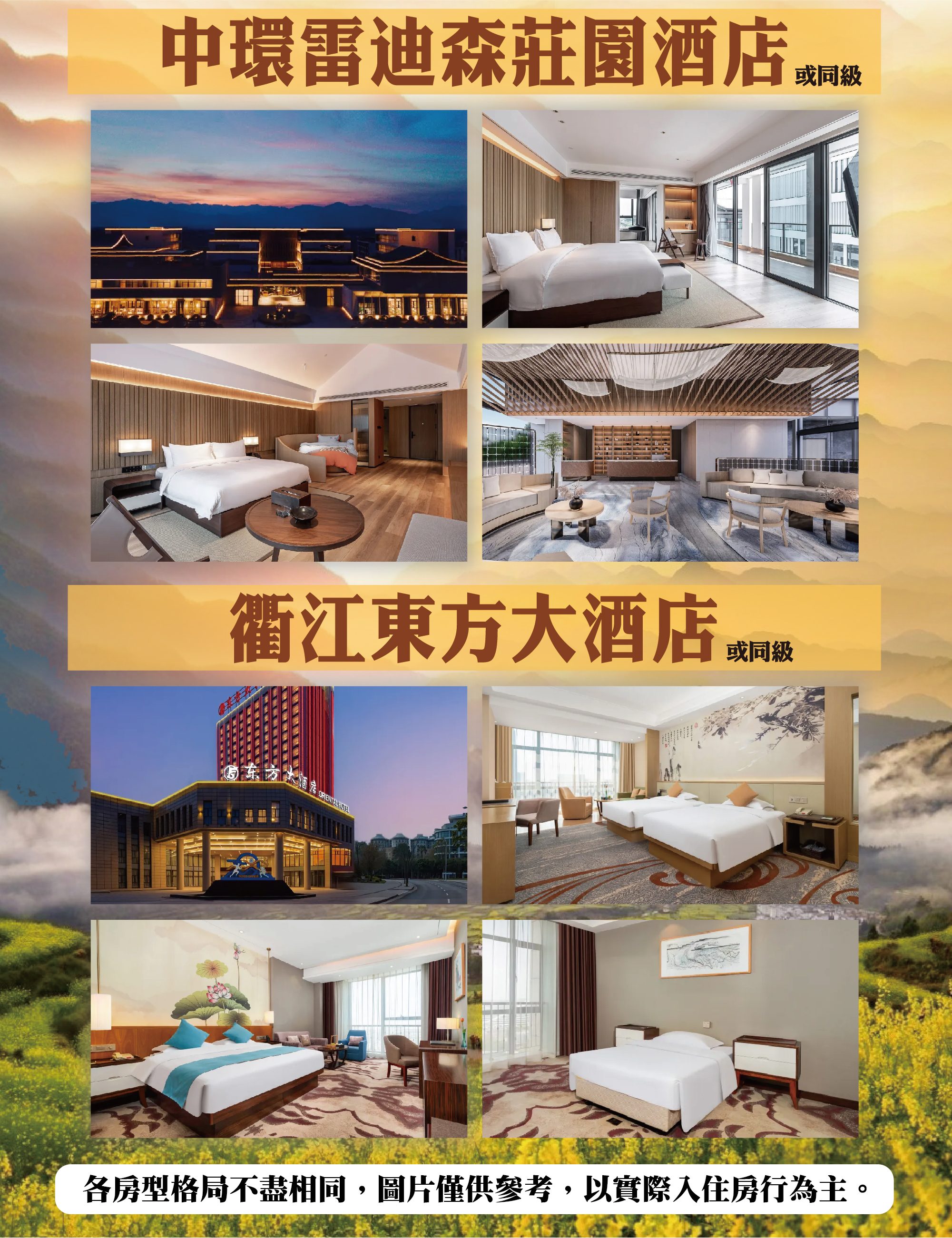 住宿:中環雷迪森莊園酒店或衢江東方大酒店或同級