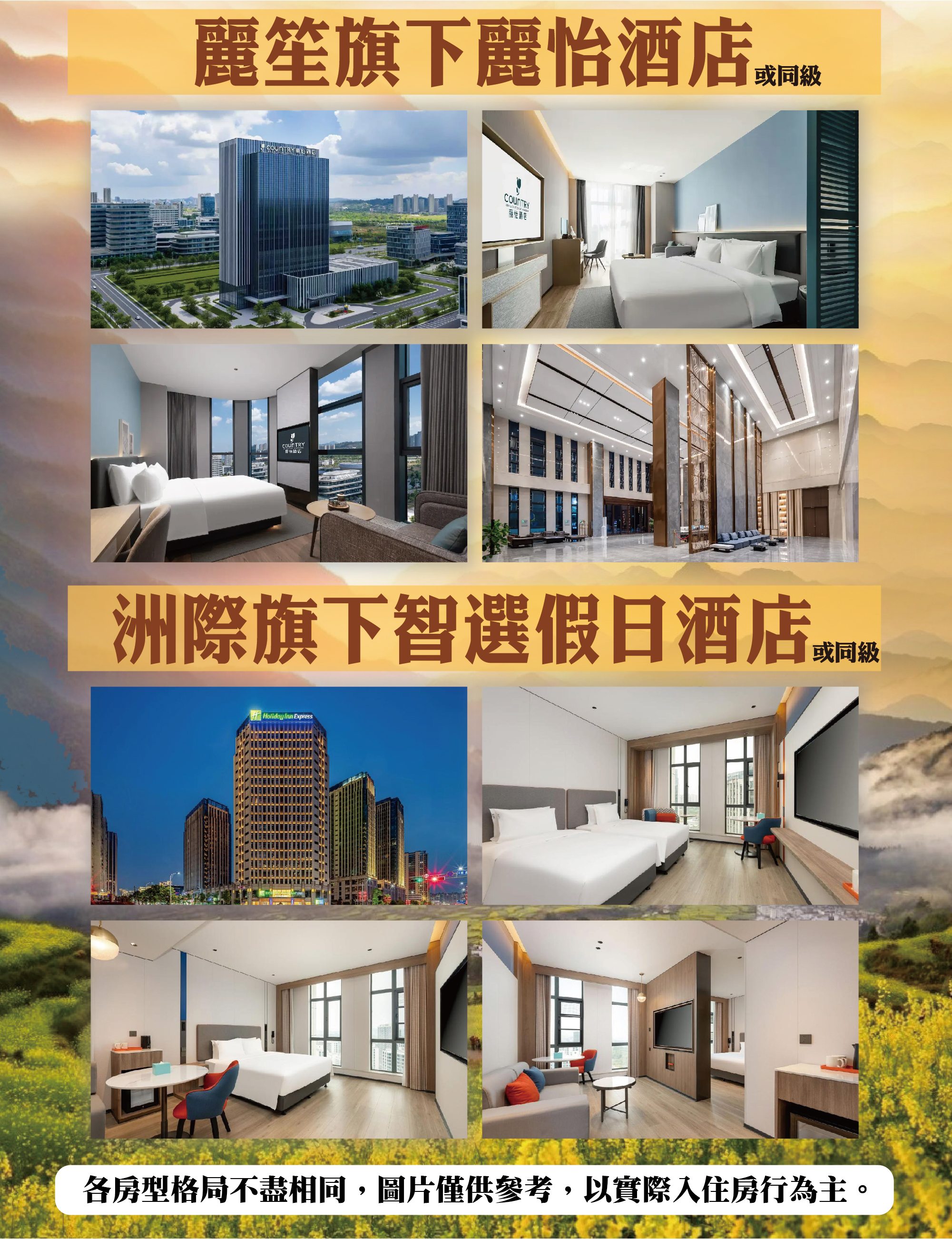 住宿:麗笙旗下麗怡酒店或洲際旗下智選假日酒店或同級