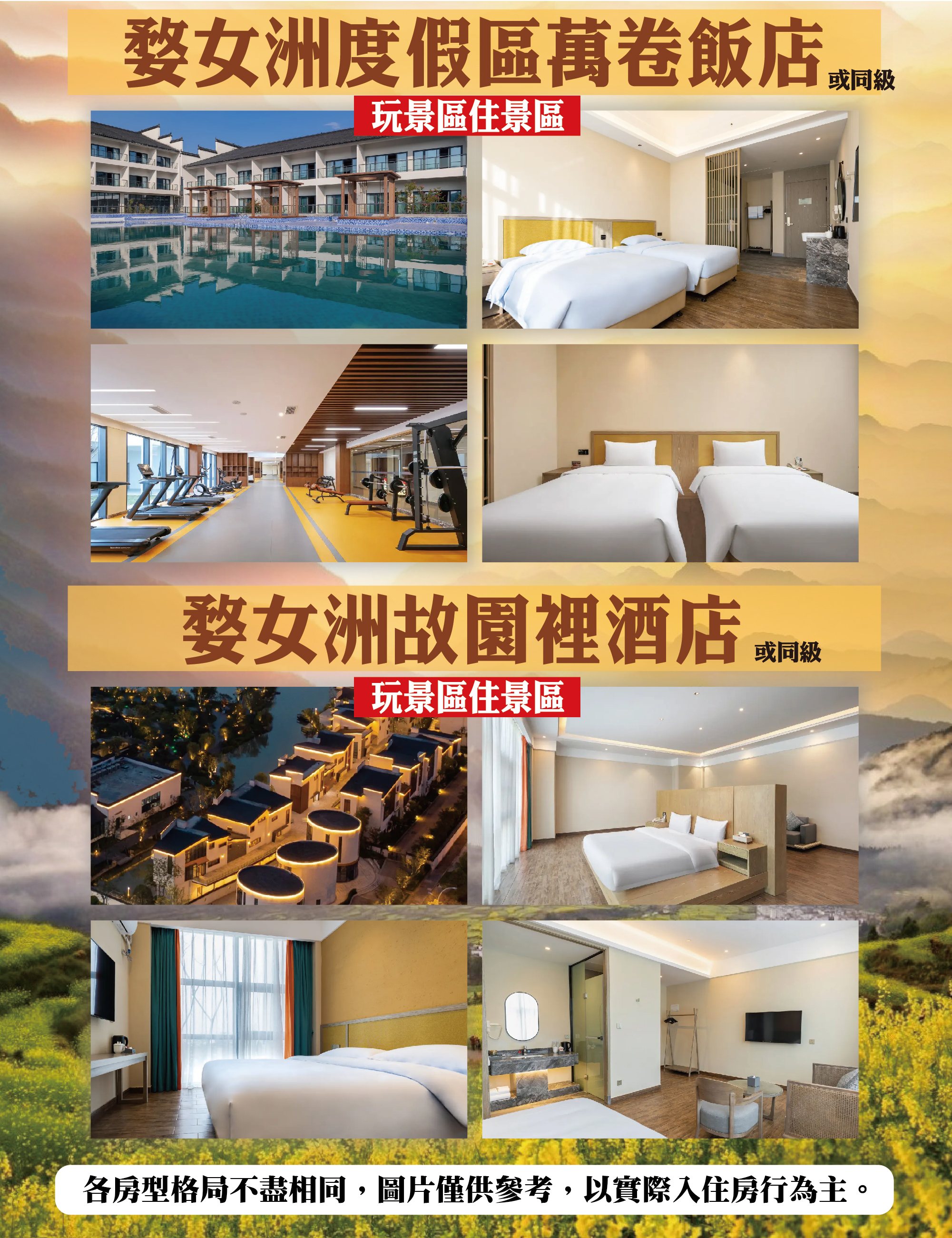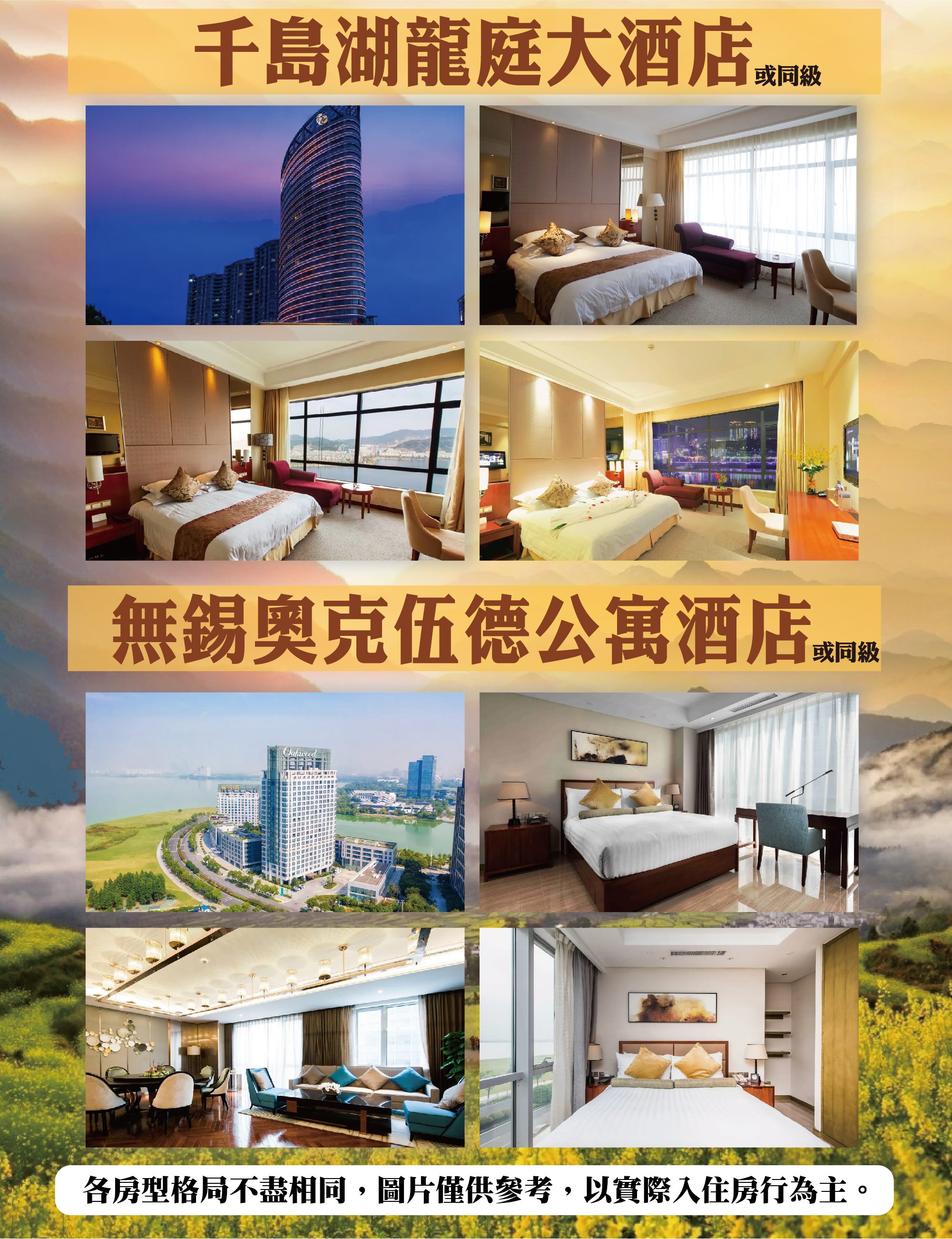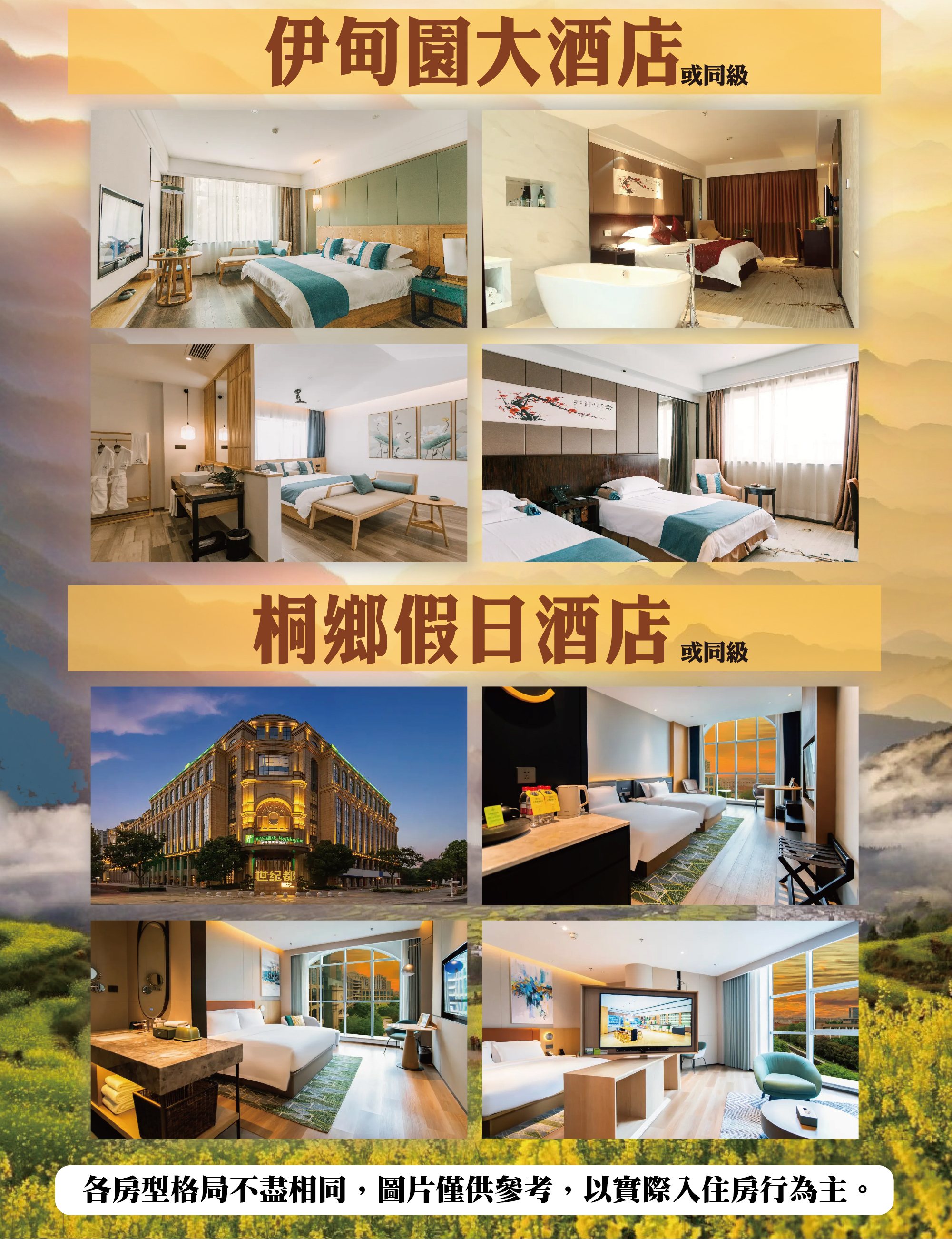 • 團體住宿以行程中載明之酒店為優先,如遇旺季滿房或承接大型會議或政府徵收等,導致無法安排,則將改以其他同級酒店替代。