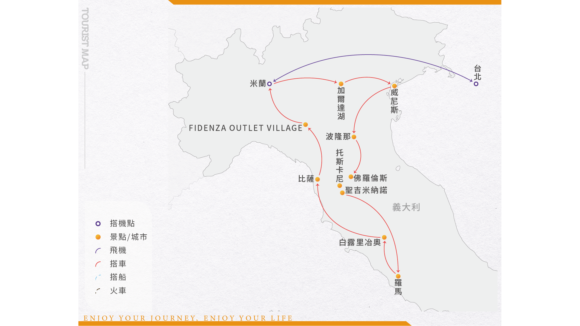 今日帶著快樂的行囊,奔向熱情又浪漫的義大利。南北狹長像靴子一樣的義大利,曾是羅馬帝國的所在地,在政治、藝術和建築上皆為後代留下不少豐功偉業。中古世紀時的文藝復興在此萌芽,米開朗基羅等大師在此地留下相當多的藝術瑰寶。今日於飛機上稍適休息,於隔日迎接美麗的旅程。