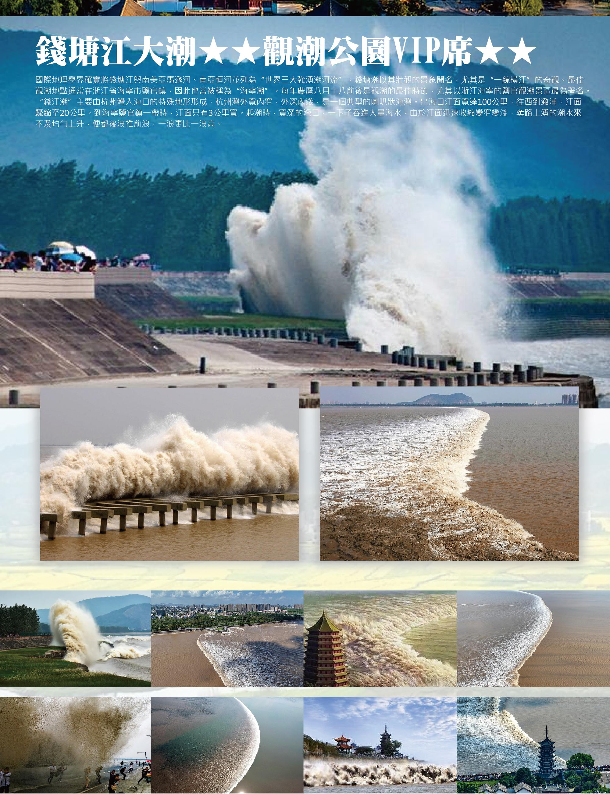 觀賞世界三大強湧潮河流的天下奇觀【錢塘江大潮★觀潮公園VIP席★】國際地理學界確實將錢塘江與南美亞馬遜河、南亞恒河並列為“世界三大強湧潮河流”。錢塘潮以其壯觀的景象聞名,尤其是“一線橫江”的奇觀。最佳觀潮地點通常在浙江省海寧市鹽官鎮,因此也常被稱為“海寧潮”。每年農曆八月十八前後是觀潮的最佳時節,尤其以浙江海寧的鹽官觀潮景區最為著名。“錢江潮”主要由杭州灣入海口的特殊地形形成,杭州灣外寬內窄,外深內淺,是一個典型的喇叭狀海灣。出海口江面寬達100公里,往西到澉浦,江面驟縮至20公里。到海寧鹽官鎮一帶時,江面只有3公里寬。起潮時,寬深的灣口,一下子吞進大量海水,由於江面迅速收縮變窄變淺,奪路上湧的潮水來不及均勻上升,便都後浪推前浪,一浪更比一浪高。