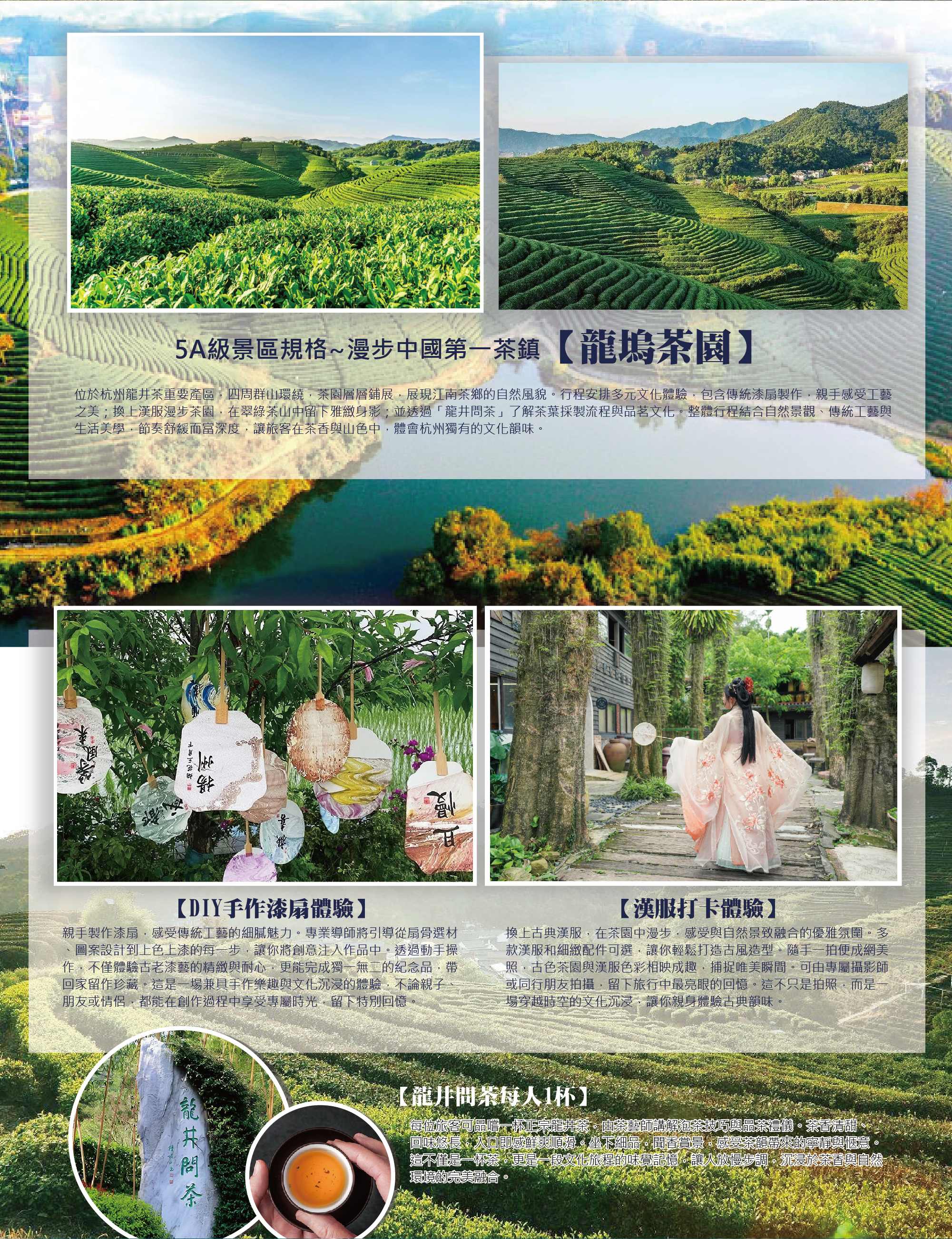 早餐後前往5A級景區規格~漫步中國第一茶鎮【龍塢茶園】位於杭州龍井茶重要產區,四周群山環繞,茶園層層鋪展,展現江南茶鄉的自然風貌。行程安排多元文化體驗,包含傳統漆扇製作,親手感受工藝之美;換上漢服漫步茶園,在翠綠茶山中留下雅緻身影;並透過「龍井問茶」了解茶葉採製流程與品茗文化。整體行程結合自然景觀、傳統工藝與生活美學,節奏舒緩而富深度,讓旅客在茶香與山色中,體會杭州獨有的文化韻味。