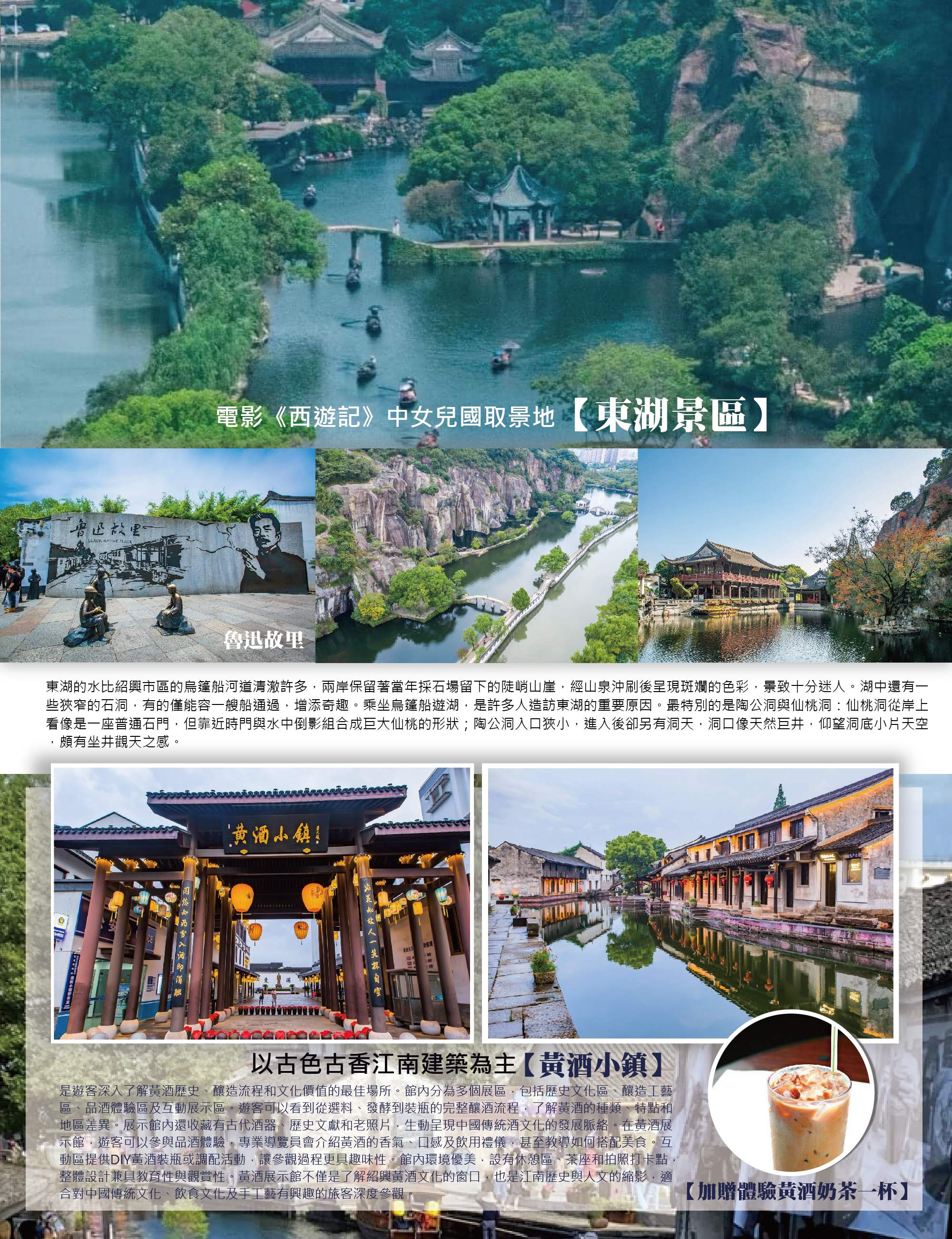 【紹興東湖風景區(烏篷船)】漫遊湖上,奇石怪岩映照湖光,感受江南水鄉靜謐之美。【紹興黃酒小鎮】百年文化與工藝展示,感受古鎮魅力。