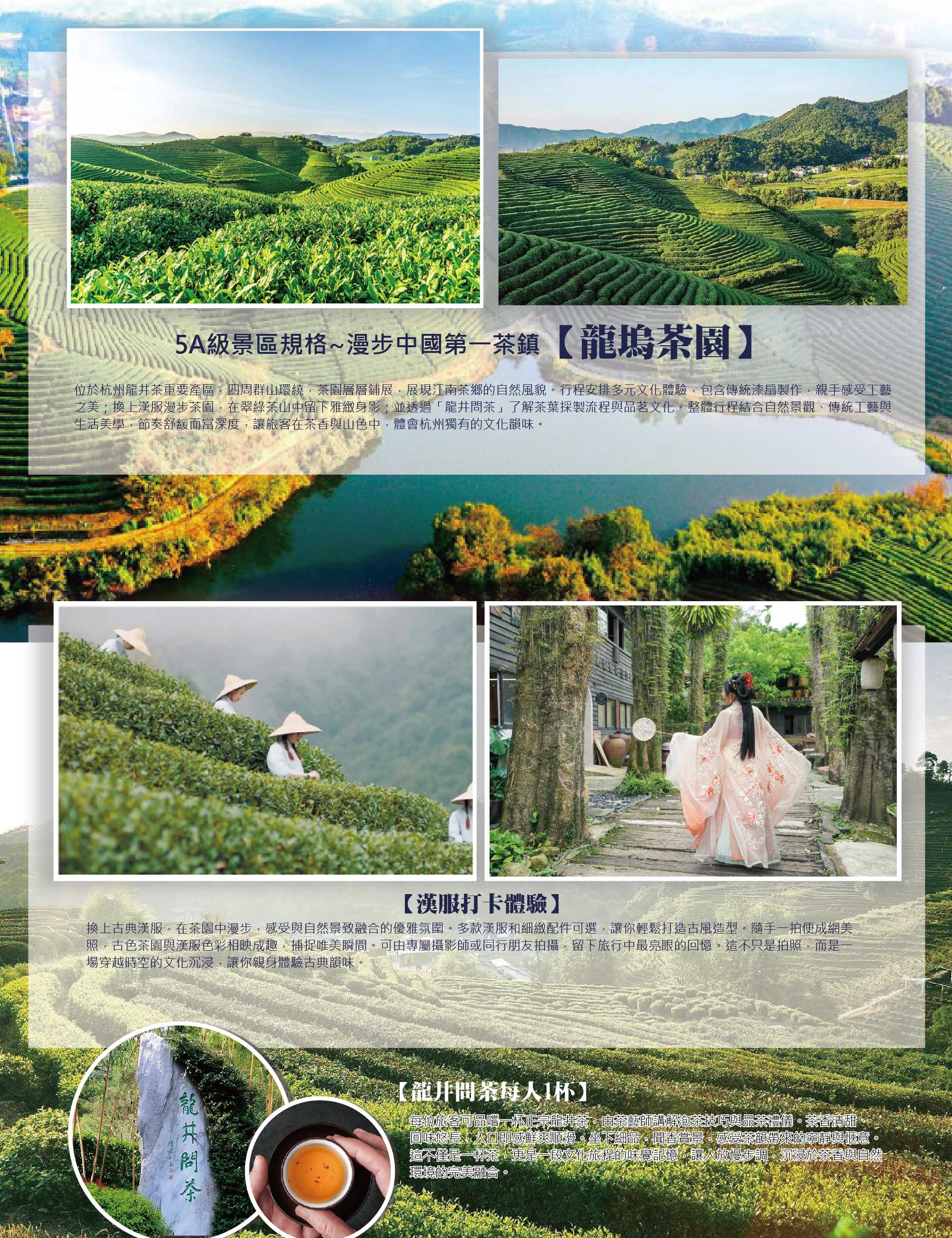 漫步中國第一茶鎮【龍塢茶鎮茶園】位於杭州龍井茶重要產區,四周群山環繞,茶園層層鋪展,展現江南茶鄉的自然風貌。行程安排多元文化體驗,包含傳統漆扇製作,親手感受工藝之美;換上漢服漫步茶園,在翠綠茶山中留下雅緻身影;並透過「龍井問茶」了解茶葉採製流程與品茗文化。整體行程結合自然景觀、傳統工藝與生活美學,節奏舒緩而富深度,讓旅客在茶香與山色中,體會杭州獨有的文化韻味。
