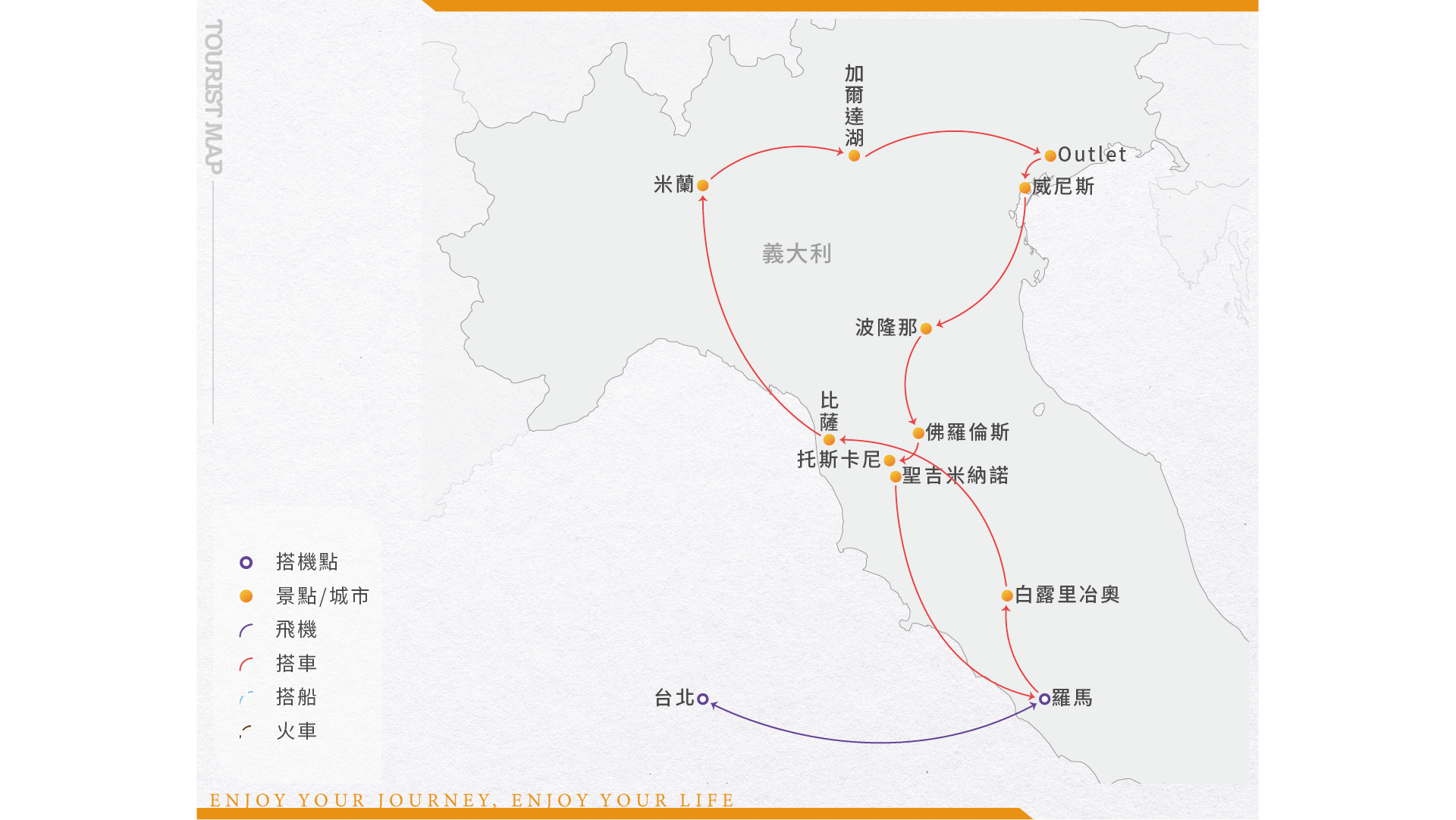 今日帶著快樂的行囊,奔向熱情又浪漫的義大利。南北狹長像靴子一樣的義大利,曾是羅馬帝國的所在地,在政治、藝術和建築上皆為後代留下不少豐功偉業。中古世紀時的文藝復興在此萌芽,米開朗基羅等大師在此地留下相當多的藝術瑰寶。今日於飛機上稍適休息,於隔日迎接美麗的旅程。