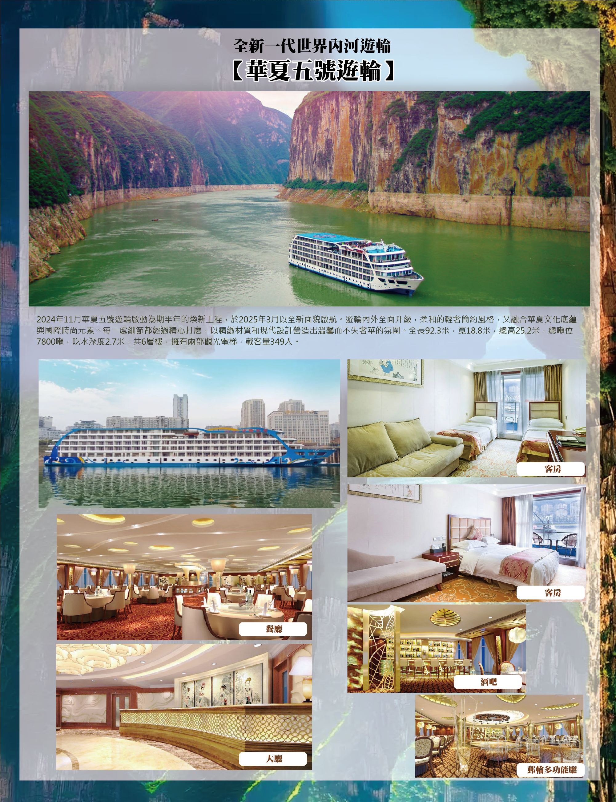 全新一代世界內河遊輪【華夏五號】2024年11月華夏五號遊輪啟動為期半年的煥新工程,於2025年3月以全新面貌啟航。遊輪內外全面升級,柔和的輕奢簡約風格,又融合華夏文化底蘊與國際時尚元素。每一處細節都經過精心打磨,以精緻材質和現代設計營造出溫馨而不失奢華的氛圍。全長92.3米,寬18.8米,總高25.2米,總噸位7800噸,吃水深度2.7米,共6層樓,擁有兩部觀光電梯,載客量349人。