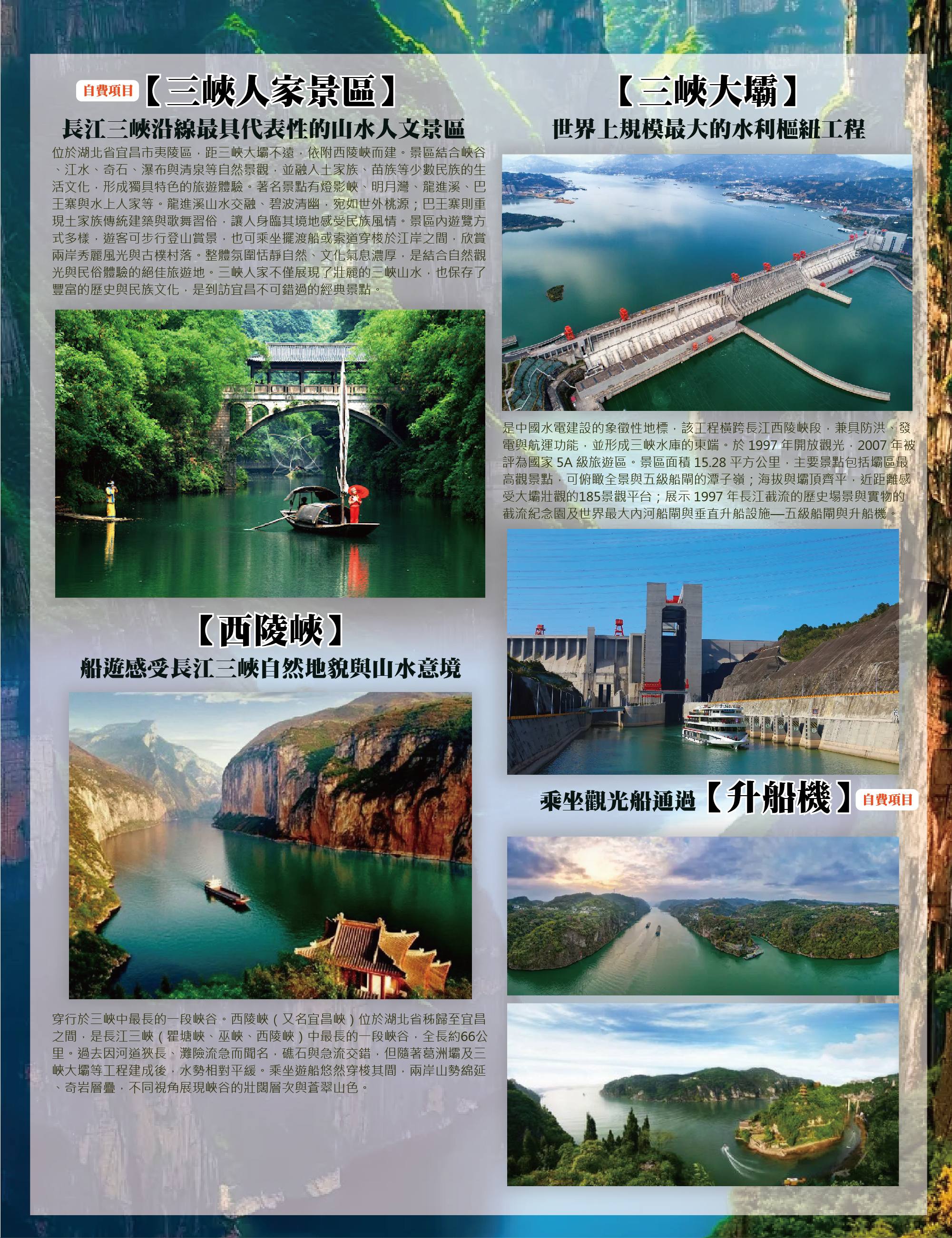 【特別說明】從2018年1月1日起。長江上所有的旅遊船均不再經過三峽大壩船閘了(包括重慶至宜昌下水航次以及宜昌至重慶上水航次),行程改為於茅坪碼頭上下船,並安排遊覽車接駁通過大壩區域。