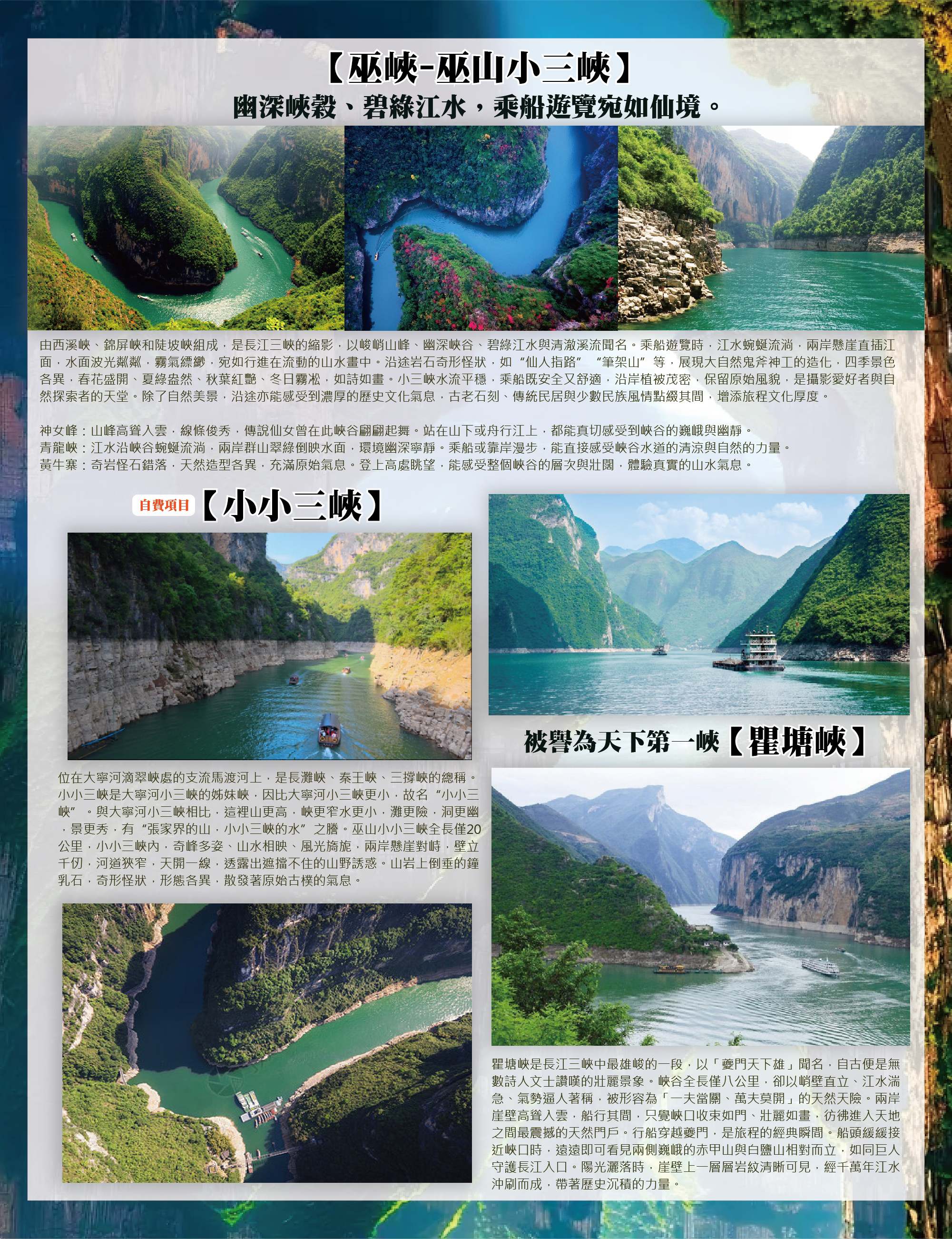 【瞿塘峽】瞿塘峽是長江三峽中最雄峻的一段,以「夔門天下雄」聞名,自古便是無數詩人文士讚嘆的壯麗景象。峽谷全長僅八公里,卻以峭壁直立、江水湍急、氣勢逼人著稱,被形容為「一夫當關、萬夫莫開」的天然天險。兩岸崖壁高聳入雲,船行其間,只覺峽口收束如門、壯麗如畫,彷彿進入天地之間最震撼的天然門戶。行船穿越夔門,是旅程的經典瞬間。船頭緩緩接近峽口時,遠遠即可看見兩側巍峨的赤甲山與白鹽山相對而立,如同巨人守護長江入口。陽光灑落時,崖壁上一層層岩紋清晰可見,經千萬年江水沖刷而成,帶著歷史沉積的力量。天氣晴朗時,峽內光影交錯;若遇雲霧,則呈現另一種朦朧壯美。沿途還能聽見導覽介紹古代棧道遺跡、崖壁碑刻的故事,以及三峽航道如何從險峻水勢逐步被現代工程改善。瞿塘峽的壯麗不僅源自自然景觀,更讓人感受到歷史、文化與地貌交織的深度魅力。