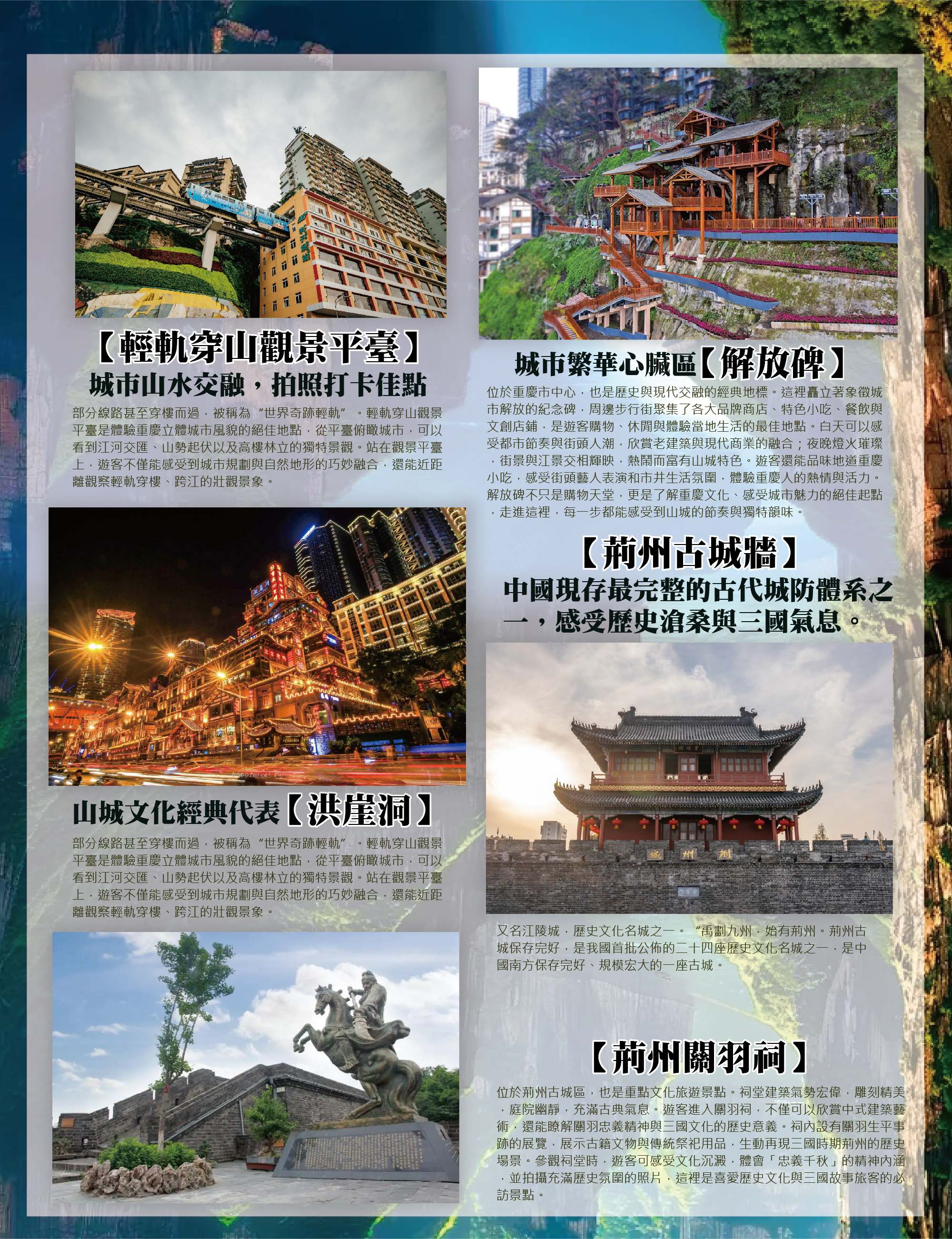 【重慶】別稱山城,坐落於長江與嘉陵江交匯處,是中國西南的重要經濟與文化中心。這座城市以山水環抱、橋梁林立而聞名,街巷沿山而建,形成獨特的立體城市景觀。重慶不僅擁有濃厚的巴渝文化,還融合了現代都市的繁華與活力,無論是歷史建築、民俗風情,還是火辣美食,都令人難以忘懷。