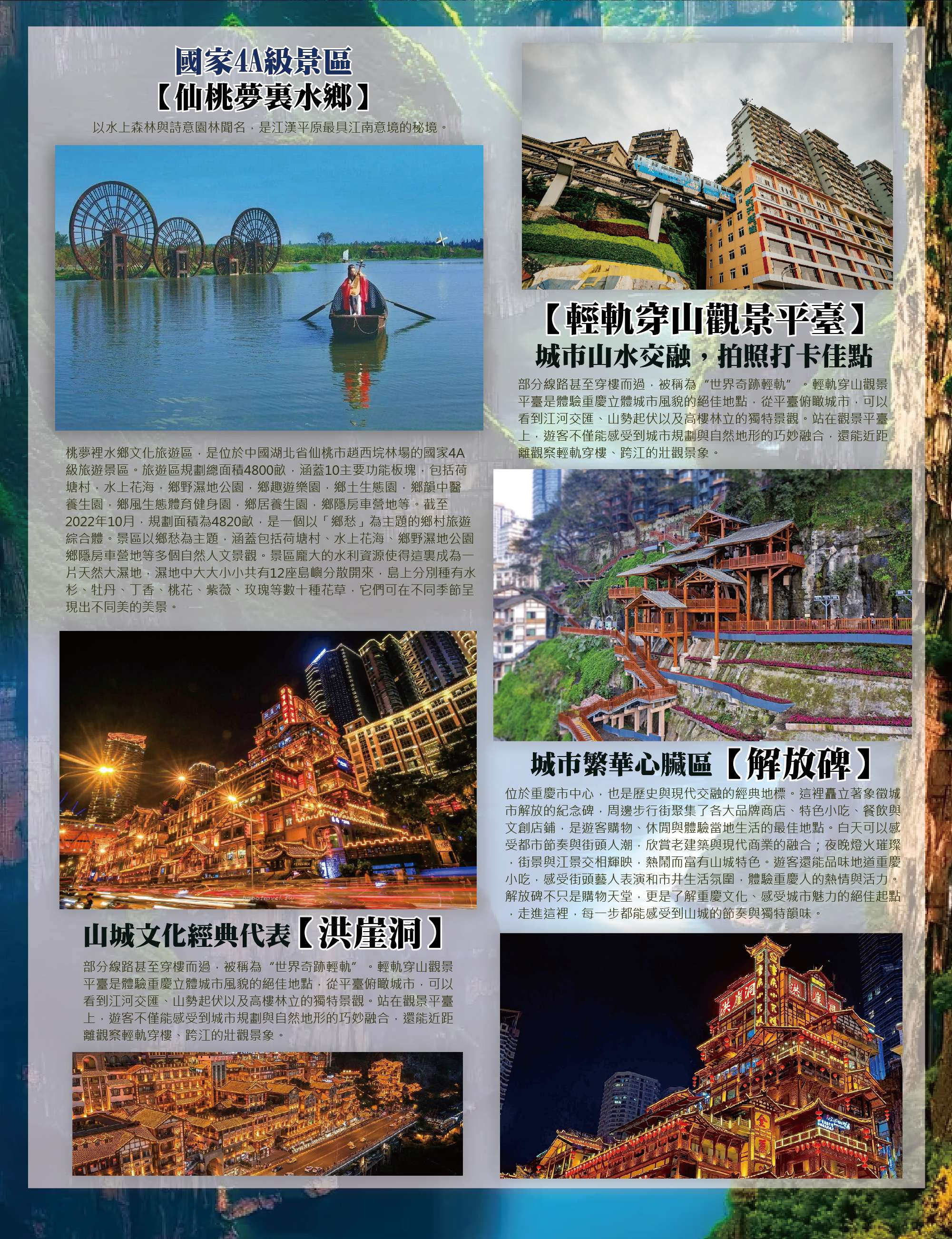 【重慶】別稱山城,坐落於長江與嘉陵江交匯處,是中國西南的重要經濟與文化中心。這座城市以山水環抱、橋梁林立而聞名,街巷沿山而建,形成獨特的立體城市景觀。重慶不僅擁有濃厚的巴渝文化,還融合了現代都市的繁華與活力,無論是歷史建築、民俗風情,還是火辣美食,都令人難以忘懷。遊客漫步於城市之中,能感受到巷弄間的生活氣息,也能欣賞長江沿岸壯麗的夜景,夜幕降臨時,萬家燈火與江水倒影交織,展現出「霧都」特有的浪漫與神秘感。重慶不僅是美食愛好者的天堂,對攝影、歷史文化或探險旅遊的遊客,也有無限的吸引力。