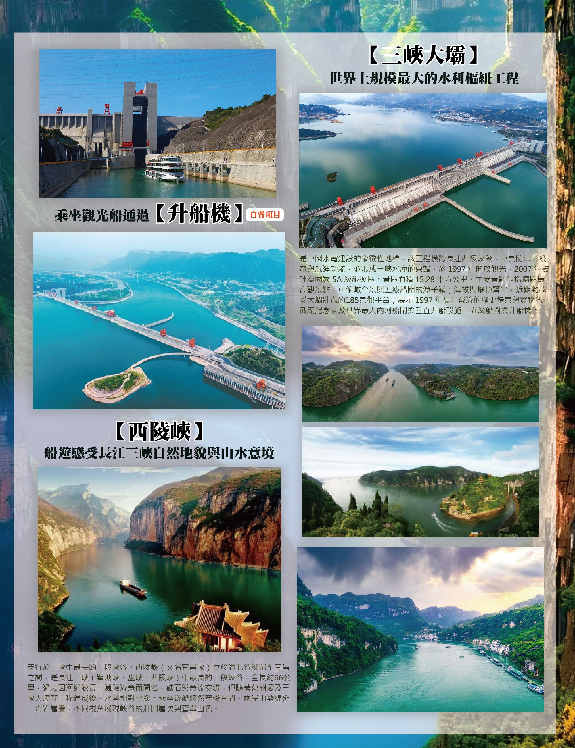 【特別說明】從2018年1月1日起。長江上所有的旅遊船均不再經過三峽大壩船閘了(包括重慶至宜昌下水航次以及宜昌至重慶上水航次),行程改為於茅坪碼頭上下船,並安排遊覽車接駁通過大壩區域。