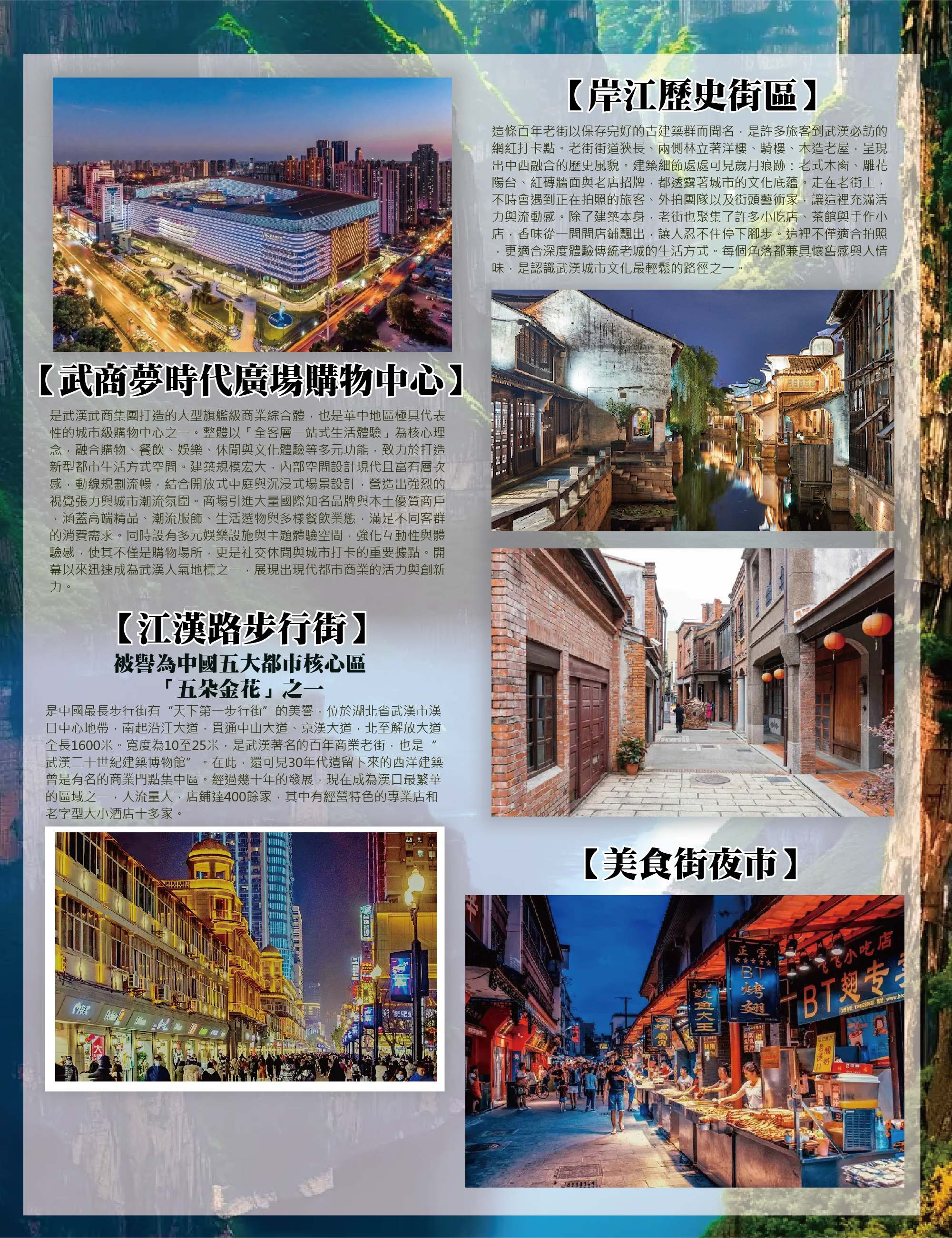當日集合於機場,搭乘專機經由轉機前往【武漢】素有“九省通衢”之稱。雄踞長江中游、長江、漢水在此交匯,武昌、漢口、漢陽三鎮隔江鼎立,俗稱“江城”。武漢四季分明,有著江漢平原典型的自然風光,這裏也是千年荊楚文化的發源地,具有濃郁的古楚風情,是中國的歷史文化名城。武漢還是中國近現代民主革命的“首義之城”。在清末、民國及中華人民共和國初期,武漢經濟繁榮,是僅次於上海的中國第二大城市,繁華程度位居亞洲前列。民國時期的武漢是絕無僅有地和上海共享榮耀的遠東大都會,因位於長江沿岸,為交通樞紐,工商業極為發達,與位於北美五大湖岸的芝加哥相似,被《芝加哥論壇報》稱為「東方芝加哥」。