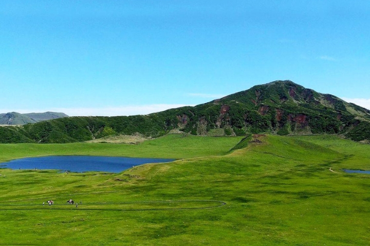 草千里絕佳的地理位置,在此能看見中岳火山的噴煙。接近四角形狀的大草原,一直延伸到了烏帽子岳北麓,不管是草原中央的大水池,或是放牧中的馬兒,總能讓人找到牧歌裡的情境。碧綠鮮豔的夏季、銀白幻想的冬季,一年之中吸引眾多觀光客前往的,除了四季變換的色彩,還有騎馬跟散步。草千里不僅僅是阿蘇代表性的景點之一,它廣闊的風景,更被許多和歌詩人吟唱著。