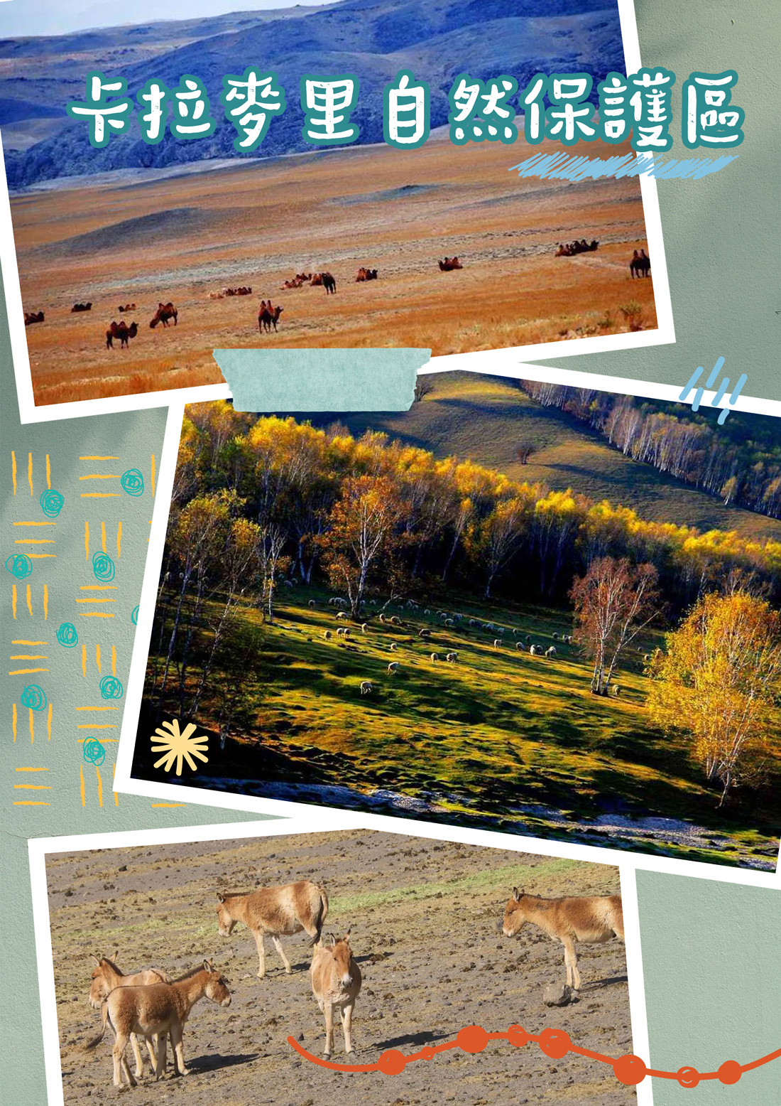 亞洲最大的野生動物保護區之一【卡拉麥裡自然保護區】這裡屬國家保護的珍稀動物,有蒙新野驢、普氏野馬、鵝喉羚、黃羊…等,而蒙古野驢以發展到700 餘頭,鵝喉羚也有一萬餘頭。卡拉麥裡哈薩克語意為「黑色的大地」之意,該自然保護區面積為1.8 萬平方公里,是該保護區成立於1982年4月,總面積1.7萬平方公里。屬國家保護的珍稀動物有蒙古野驢、「普氏野馬」、盤羊、鵝喉羚(黃羊)等。如今,這裡保護的主要對象——蒙古野驢已發展到700餘頭,鵝喉羚(黃羊)已有1萬餘頭。此外野駱駝、普氏野馬、盤羊、兔猻等各種「有蹄」的珍稀野生動物,紅隼、金雕、大鴇、沙雞等鳥類,以及沙蜥等爬行動物,都有不同程度的繁殖增加。
