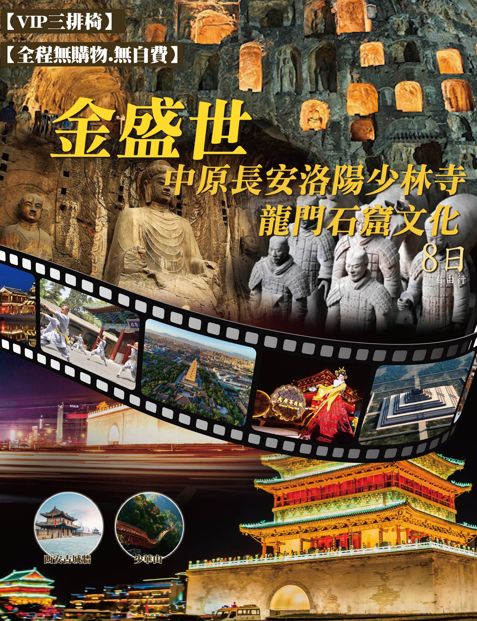 金盛世•中原長安洛陽少林寺龍門石窟文化8日【無購物無自費VIP三排椅】