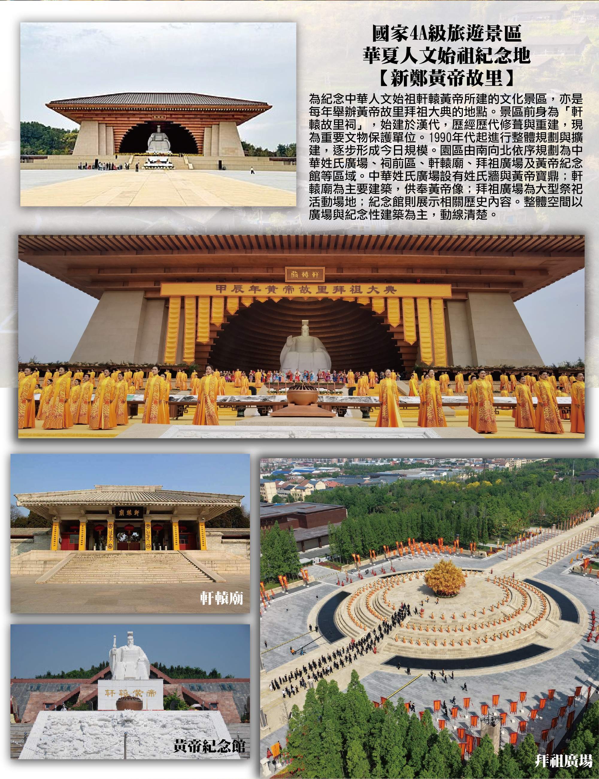 國家4A級旅遊景區,華夏人文始祖紀念地【新鄭黃帝故里】為紀念中華人文始祖軒轅黃帝所建的文化景區,亦是每年舉辦黃帝故里拜祖大典的地點。景區前身為「軒轅故里祠」,始建於漢代,歷經歷代修葺與重建,現為重要文物保護單位。1990年代起進行整體規劃與擴建,逐步形成今日規模。園區由南向北依序規劃為中華姓氏廣場、祠前區、軒轅廟、拜祖廣場及黃帝紀念館等區域。中華姓氏廣場設有姓氏牆與黃帝寶鼎;軒轅廟為主要建築,供奉黃帝像;拜祖廣場為大型祭祀活動場地;紀念館則展示相關歷史內容。整體空間以廣場與紀念性建築為主,動線清楚。