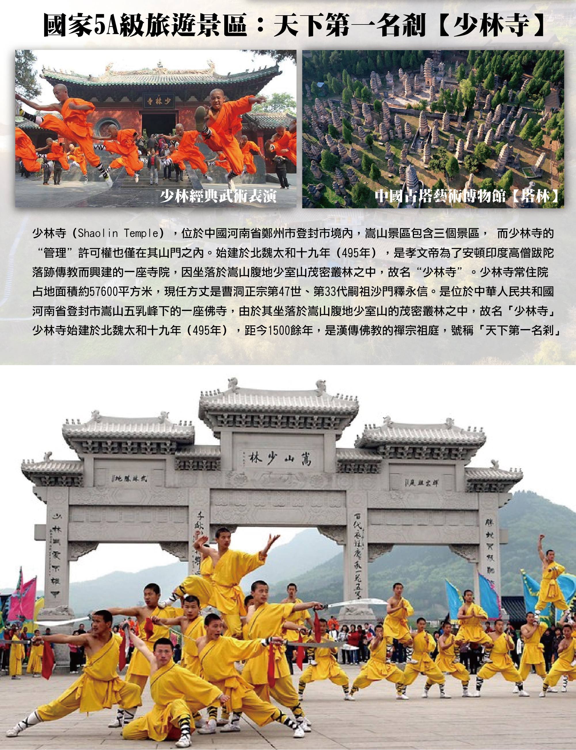【少林寺】中國禪宗祖庭與少林武術發源地,搭配塔林與武術表演,展現千年武學傳承。