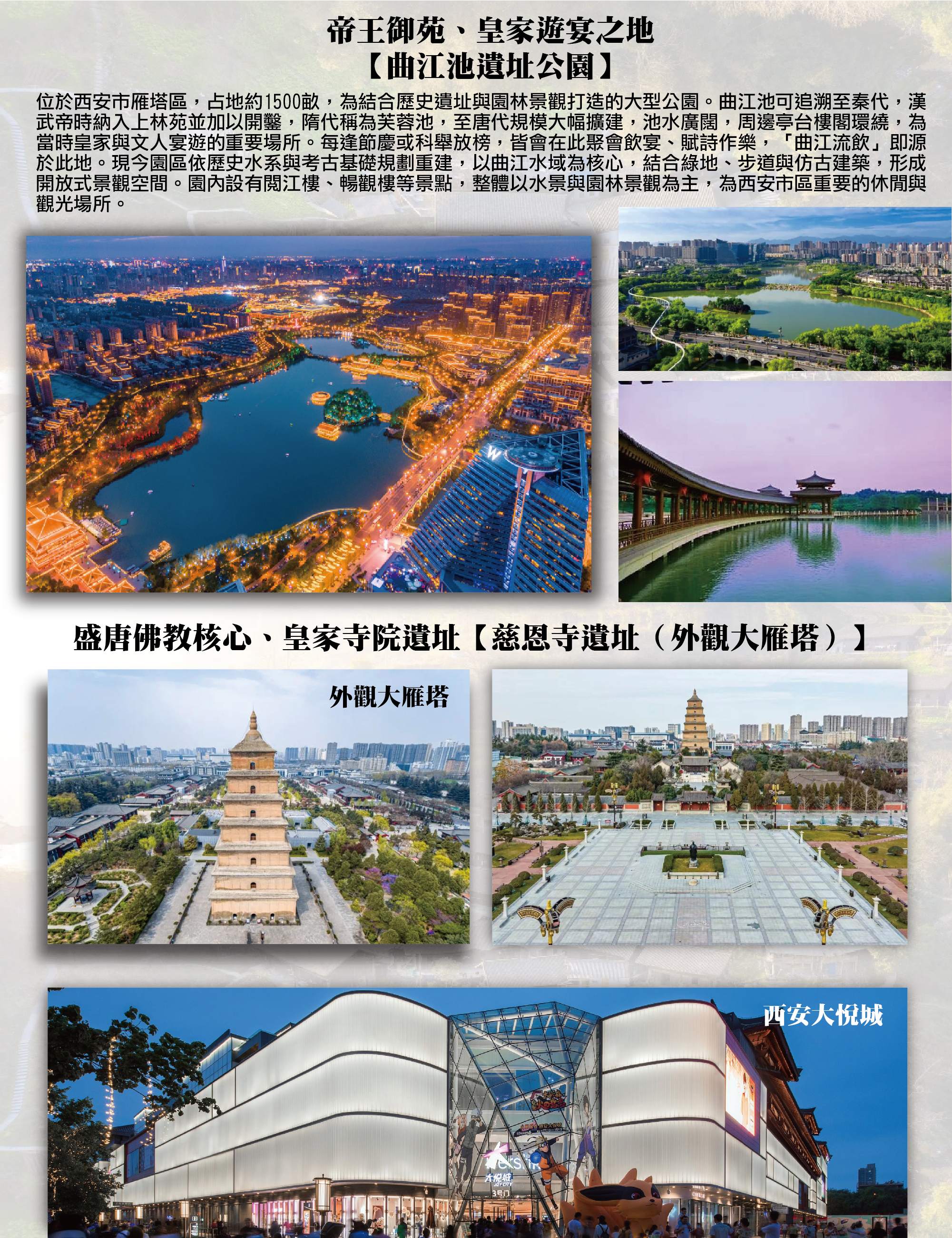 第三天【三峽門-西安】帝王御苑、皇家遊宴之地【曲江池遺址公園】→盛唐佛教核心、皇家寺院遺址【慈恩寺遺址(外觀大雁塔)】→西安大悅城(Joy City)→長安夜色再現、燈火延綿的步行街【大唐不夜城】