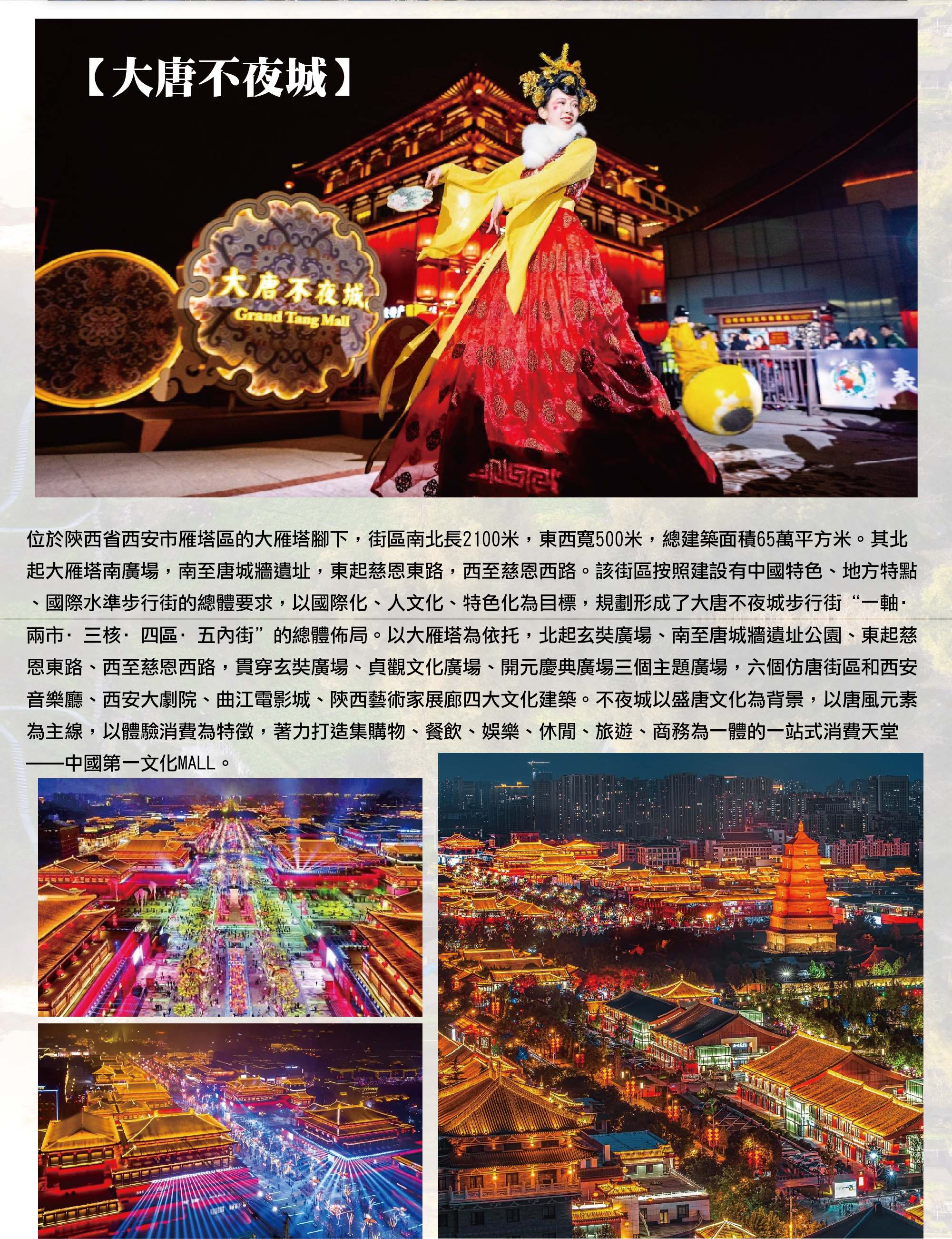 【大唐不夜城】盛唐文化為主題打造的步行街區,夜間燈光與街景結合,呈現熱鬧氛圍。