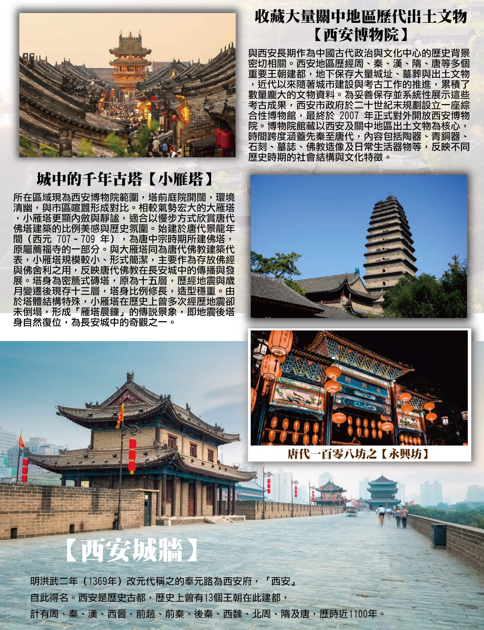 明代完整保存至今的都城城牆【西安城牆】正式名稱為明代西安城牆,始建於明太祖洪武年間(西元 1370 年起),是在唐代長安城皇城基礎上擴建而成,是中國目前保存最完整、規模最大的古代城市城牆之一。整體城牆呈長方形,周長約 13.7 公里,牆高約 12 公尺,城牆頂部寬闊,可供行走與巡防。城牆結構由城牆本體、城門、甕城、箭樓、角樓與護城河組成,完整呈現明代城市防禦系統。現存主要城門包括永寧門(南門)、安定門(西門)、安遠門(北門)與長樂門(東門),其中南門為現今最常使用的參觀入口,也是西安城牆最具代表性的段落。西安城牆不僅是軍事防禦設施,也界定了傳統西安古城的城市邊界。城牆內為歷代延續發展的老城區,城牆外則為近現代城市擴展區域。透過登城參觀,可清楚理解西安城市空間由古至今的演變脈絡。