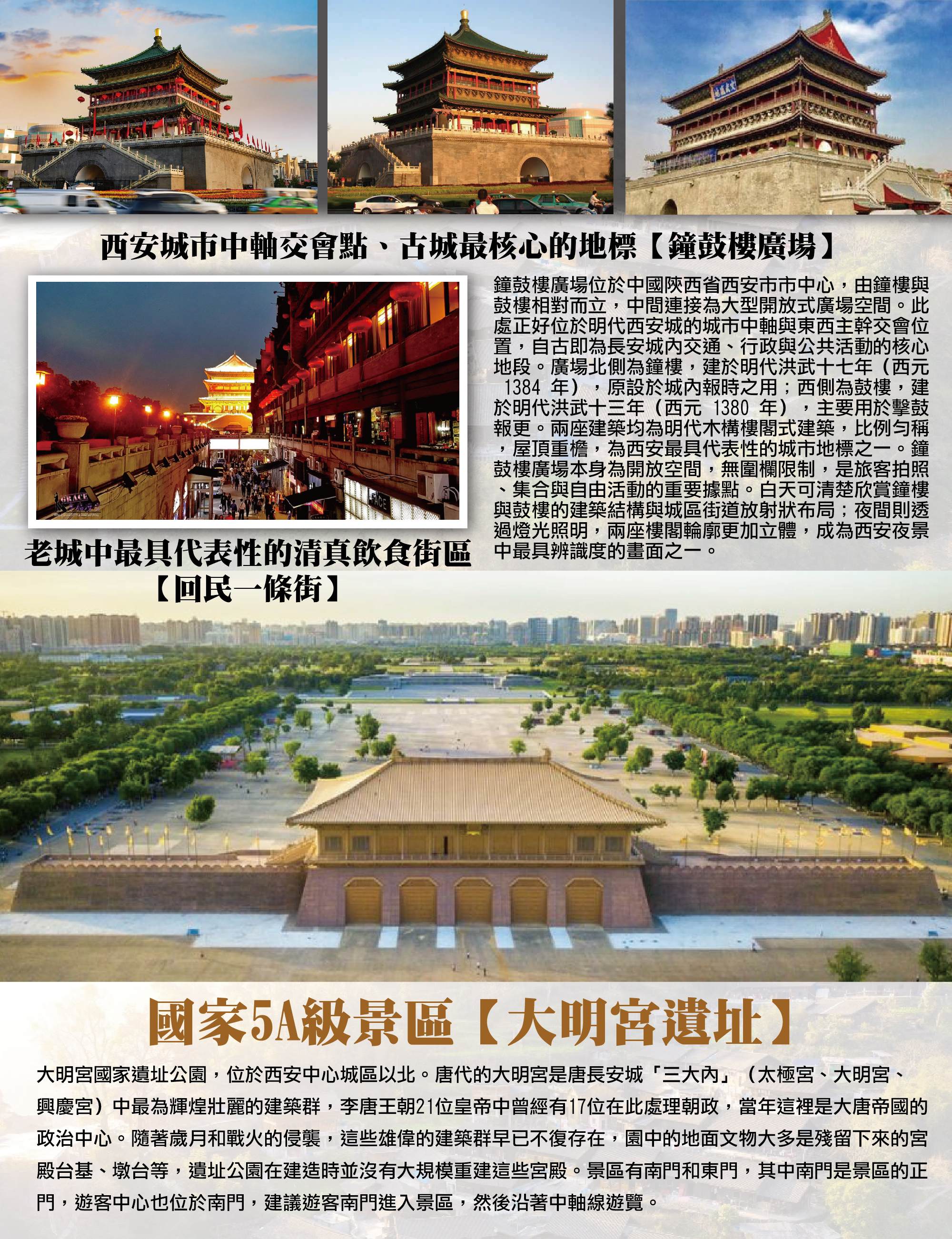 西安城市中軸交會點、古城最核心的地標【鐘鼓樓廣場­】鐘鼓樓廣場位於中國陝西省西安市市中心,由鐘樓與鼓樓相對而立,中間連接為大型開放式廣場空間。此處正好位於明代西安城的城市中軸與東西主幹交會位置,自古即為長安城內交通、行政與公共活動的核心地段。廣場北側為鐘樓,建於明代洪武十七年(西元 1384 年),原設於城內報時之用;西側為鼓樓,建於明代洪武十三年(西元 1380 年),主要用於擊鼓報更。兩座建築均為明代木構樓閣式建築,比例勻稱,屋頂重檐,為西安最具代表性的城市地標之一。鐘鼓樓廣場本身為開放空間,無圍欄限制,是旅客拍照、集合與自由活動的重要據點。白天可清楚欣賞鐘樓與鼓樓的建築結構與城區街道放射狀布局;夜間則透過燈光照明,兩座樓閣輪廓更加立體,成為西安夜景中最具辨識度的畫面之一。