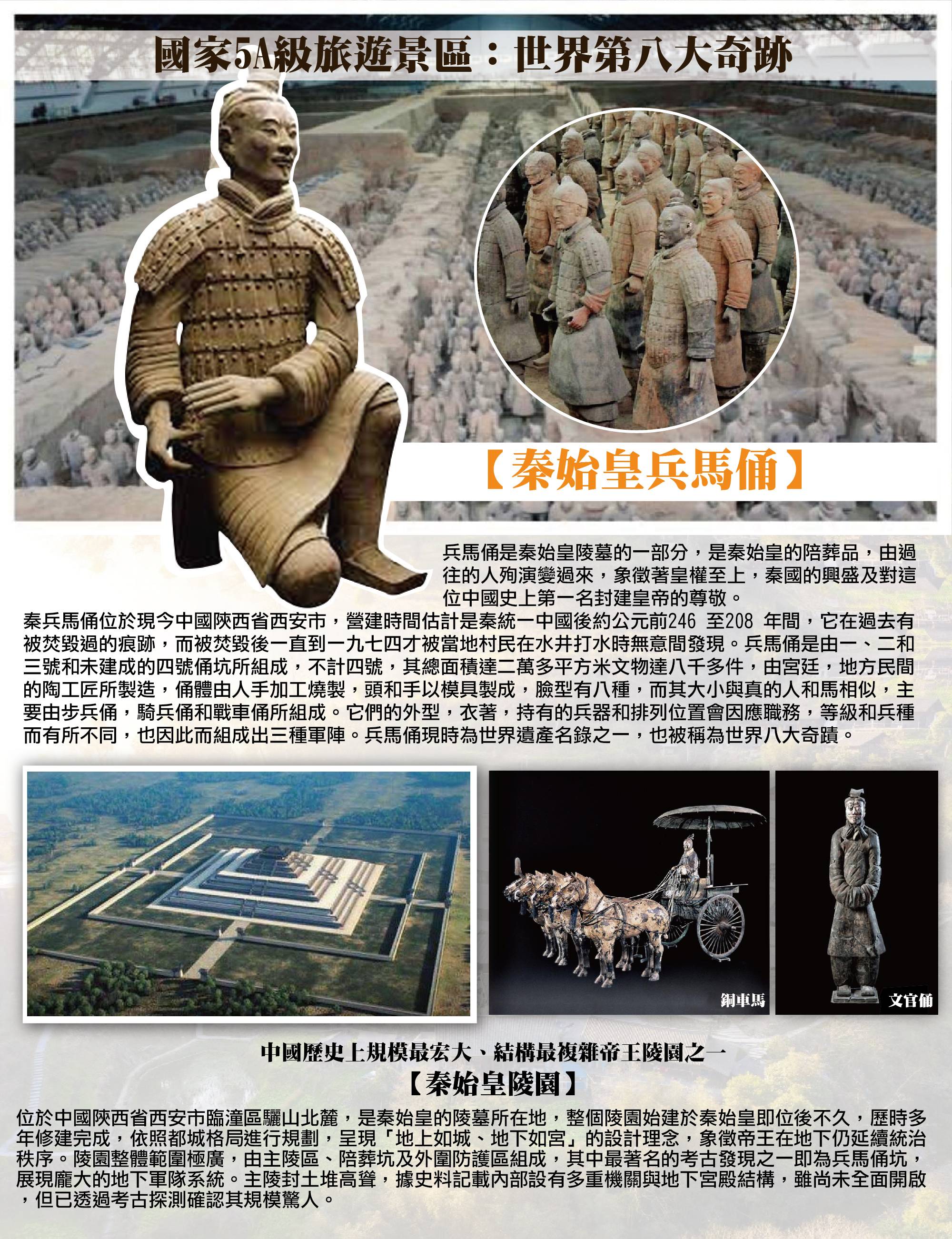 【兵馬俑】秦始皇陵陪葬坑,出土大量陶俑與戰車,被譽為世界第八大奇蹟。