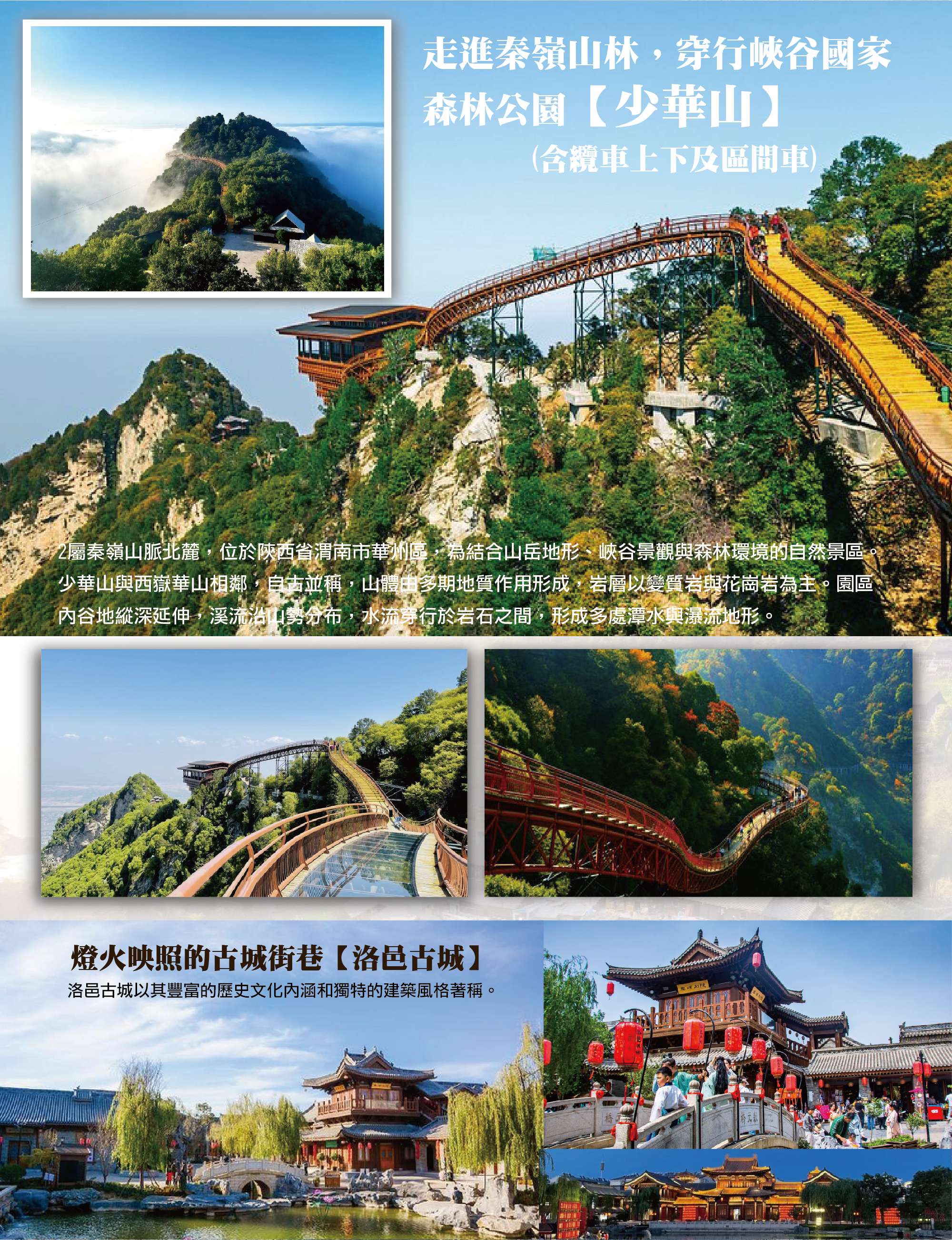 第六天【渭南-洛陽】走進秦嶺山林,穿行峽谷國家森林公園【少華山國家森林公園(含纜車上下及區間車)】→深入山谷路線,沿途串聯【紅崖湖】【石門峽】【密林谷】【少華峰】【潛龍寺】【少華山棧道】→燈火映照的古城街巷【洛邑古城】