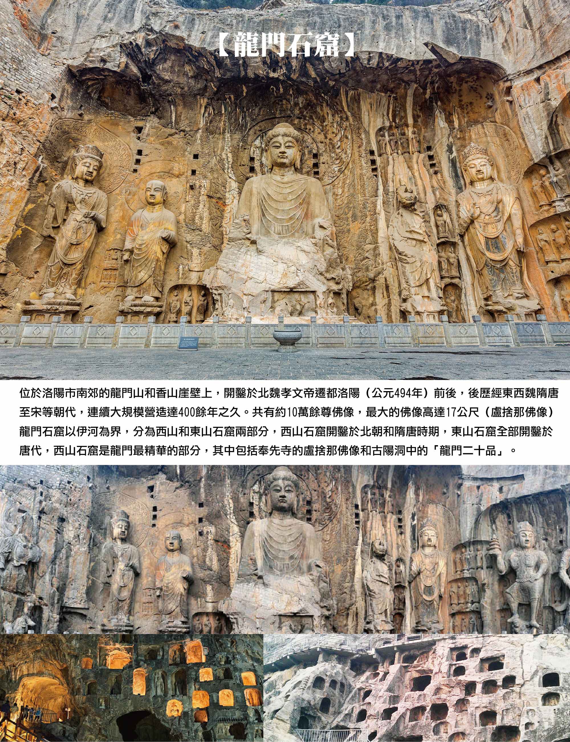 ~世界文化遺產~中原最具代表性的千年石刻群落【龍門石窟】位於洛陽南郊伊水兩岸,是北魏遷都洛陽後的重要佛教工程,自公元 5 世紀起陸續開鑿,延續至北宋,形成綿延於龍門山與香山崖壁的巨大群落。文獻記載,北魏孝文帝遷都後,以佛教作為精神支柱,並在龍門地區展開大規模營造。自北魏起工後,東魏、西魏、北齊、北周、隋、唐、五代與北宋皆有續作,其中以北魏與唐代最為興盛。整個石窟群分布密集,窟龕超過兩千處,雕刻作品數量龐大,碑刻題記豐富,是研究魏唐書法與佛教藝術的重要資料,其中「龍門二十品」與褚遂良的《伊闕佛龕碑》被視為書法代表作。龍門石窟在漫長歷史中曾遭受戰亂與盜毀,部分精細雕刻流失至海外,文化大革命期間亦有破壞。2000 年列入世界文化遺產後,區域開始進行保護與整治工程。今日漫步伊水兩岸,可清楚感受北魏至唐代的營造脈絡,理解石窟在中國佛教發展與古代藝術史中的重要位置。
